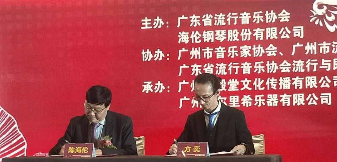 在大家熱烈的掌聲中,海倫鋼琴董事長陳海倫與廣東省流行音樂協(xié)會流行與即興鋼琴委員會主任方奕簽訂合作備忘錄。