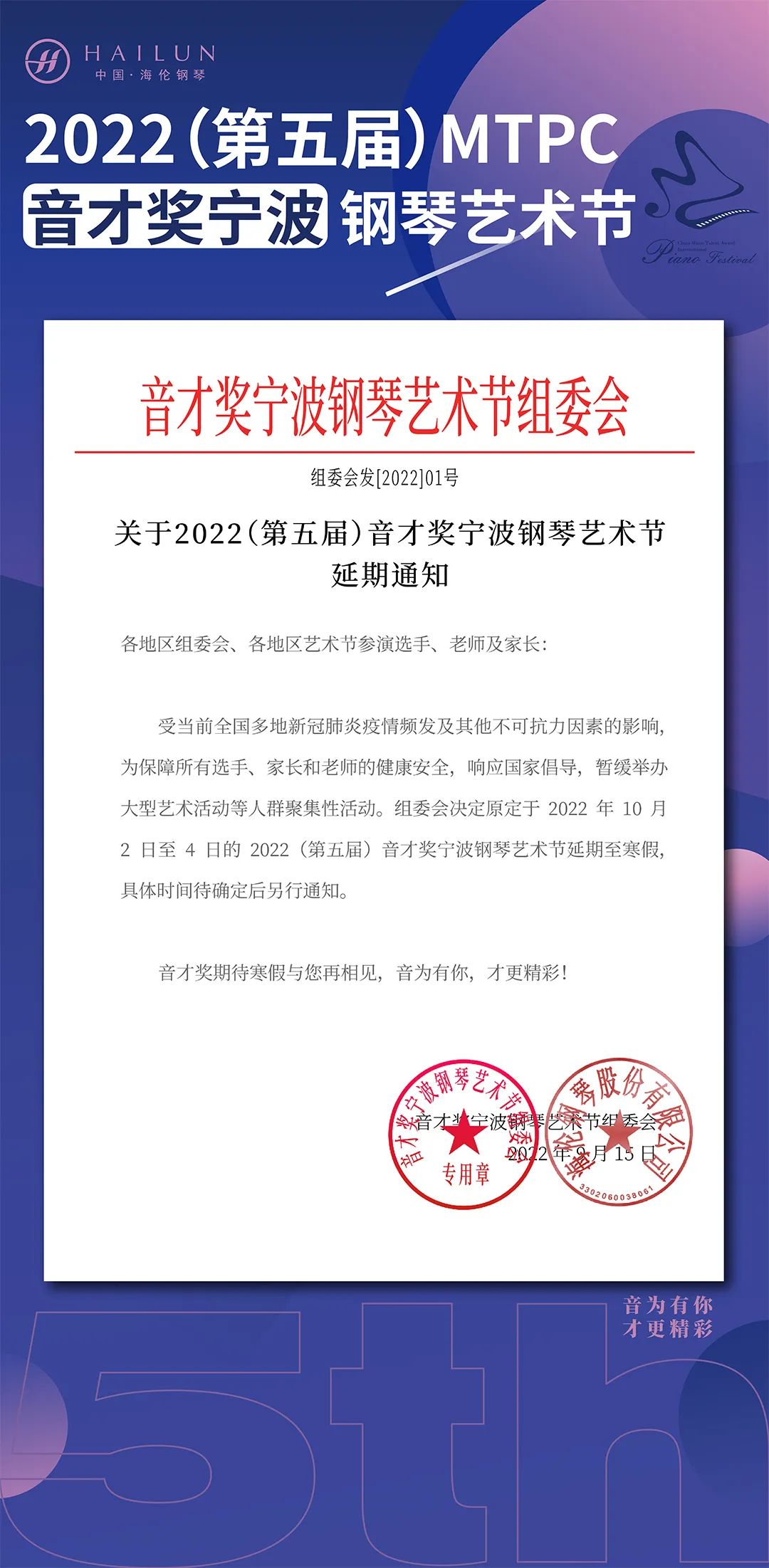 聚焦海倫丨關(guān)于2022(第五屆)MTPC音才獎(jiǎng)寧波鋼琴藝術(shù)節(jié)延期通知